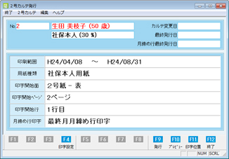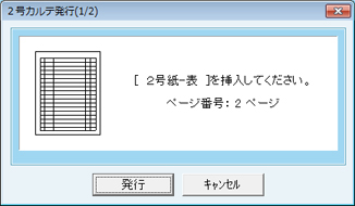 [2号カルテ発行]画面の[F9 発行]ボタンをクリックすると、「[2号紙-表]を挿入してください。ページ番号:2ページ」などの注意が表示されるので、所定の用紙を指示どおりに設定し、[発行]ボタンをクリックする。2号カルテが印刷される。
