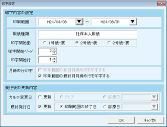 [発行後の更新内容]:[2号カルテ発行]画面右上に表示される[カルテ変更日][最終発行日]の表記を更新するかどうか、設定できる。[OK]ボタンをクリックで[2号カルテ発行]画面に戻る。