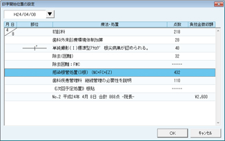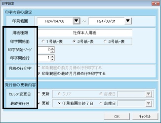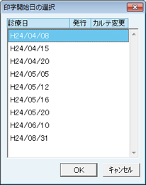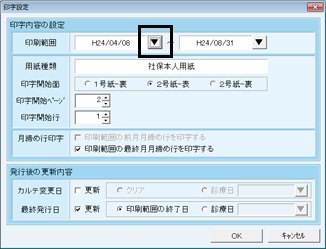 [印字範囲]:[2号カルテ発行]画面の[F4 印字設定]ボタンをクリック。[印字設定]画面で左側の開始窓のプルダウンボタンをクリック。[印字開始日の選択]画面から診療日を選択。